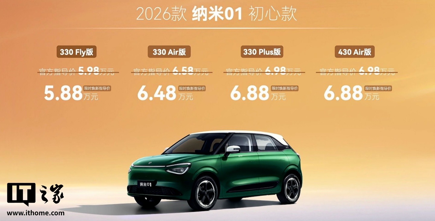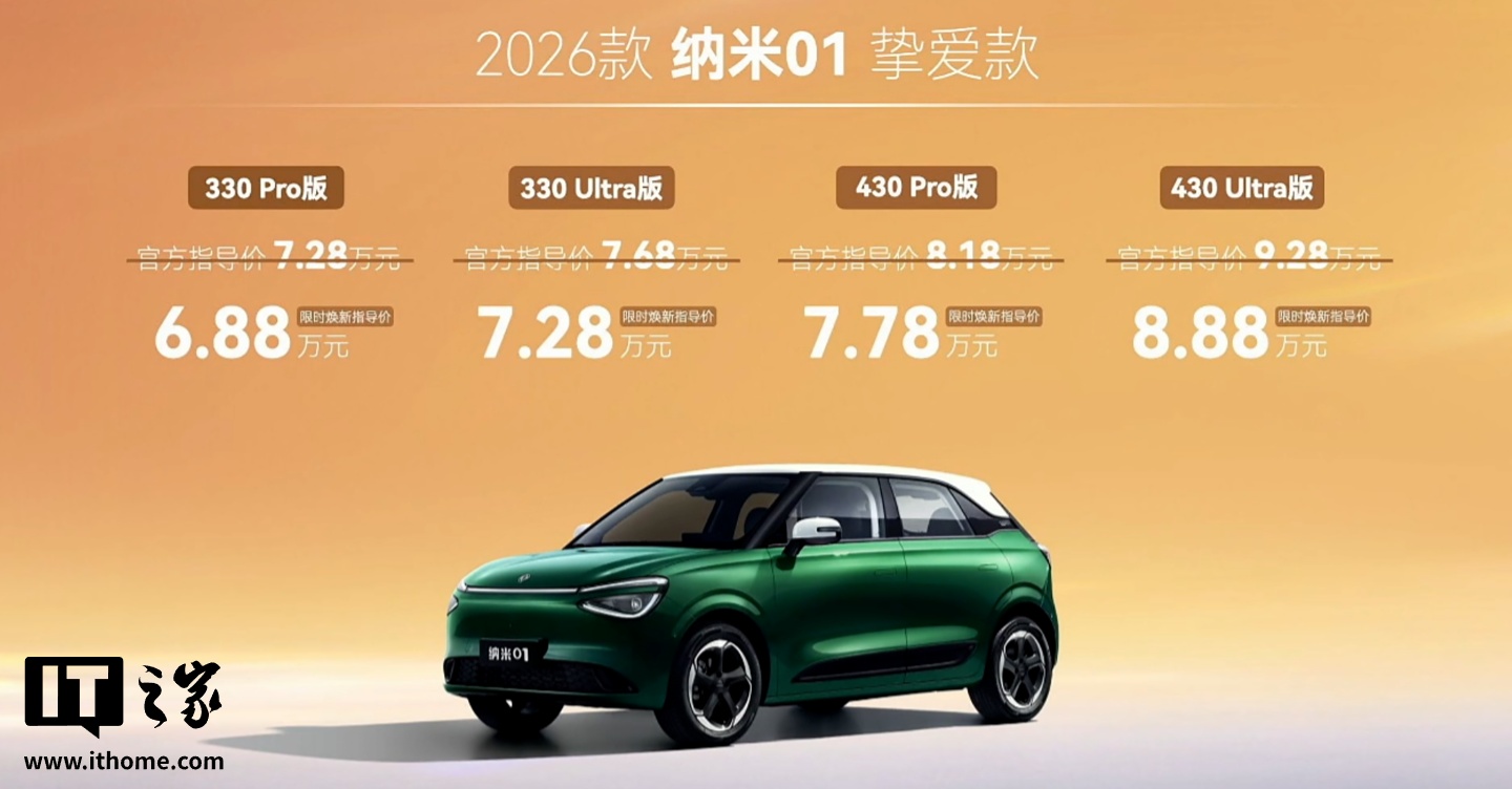 动力方面,2026 款纳米 01 均采用单电机配置,最大功率 70 千瓦,可选 31.45 千瓦时和 42.3 千瓦时两种规格的电池,CLTC 工况下续航分别为 310 公里-330 公里、410 公里-430 公里,适合城市代步、中短途出行等。
